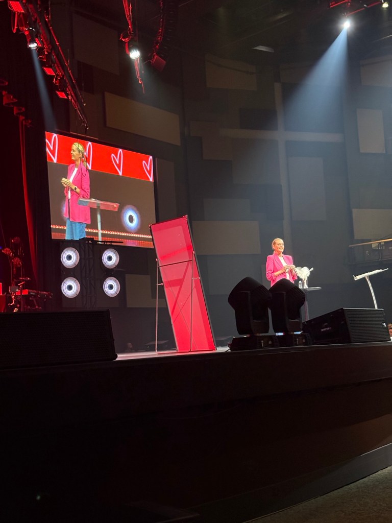 I walked in to a sea of ladies. So. Many. People. The lines for different shopping areas were wrapped around rooms, so I walked into the auditorium and was overwhelmed by how filled the space was. Seeing a few seats open near the front where I usually sit, I swiftly headed that direction—to discover cardigans and handbags saving the seats. Upon asking, I repeatedly heard the same answer, “yes, saved…yes, I’m saving these.” And the panic began to rise. Then, a different answer, “I have these saved, but there are a couple left at the end of the row.” Walking to the indicated seats, I noticed an open section a couple rows up, so sat at the end there. Minutes later, I heard the lady sitting directly in front of me say that the 3 seats next to her were available—and there were no seats in front of those! Wide open space! So, up I moved, thanking God for my seat. But the story still isn’t done.