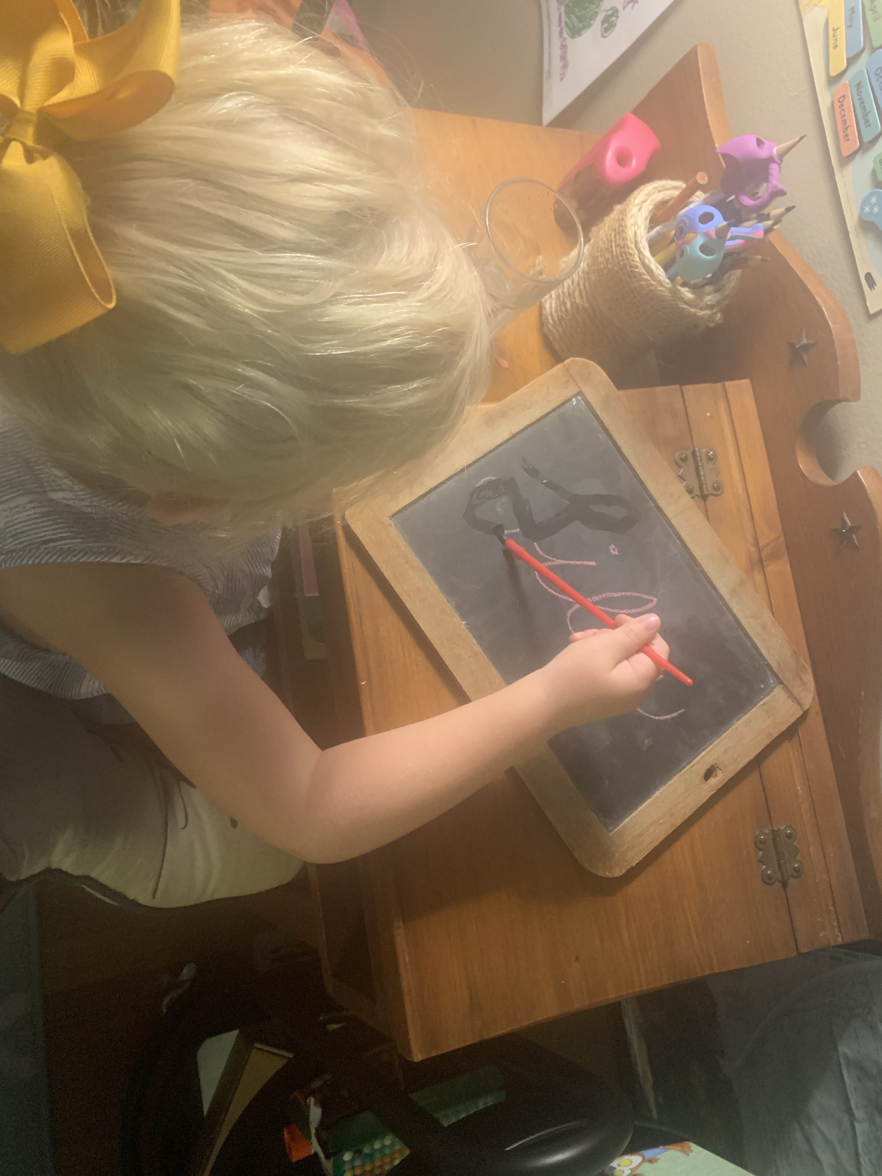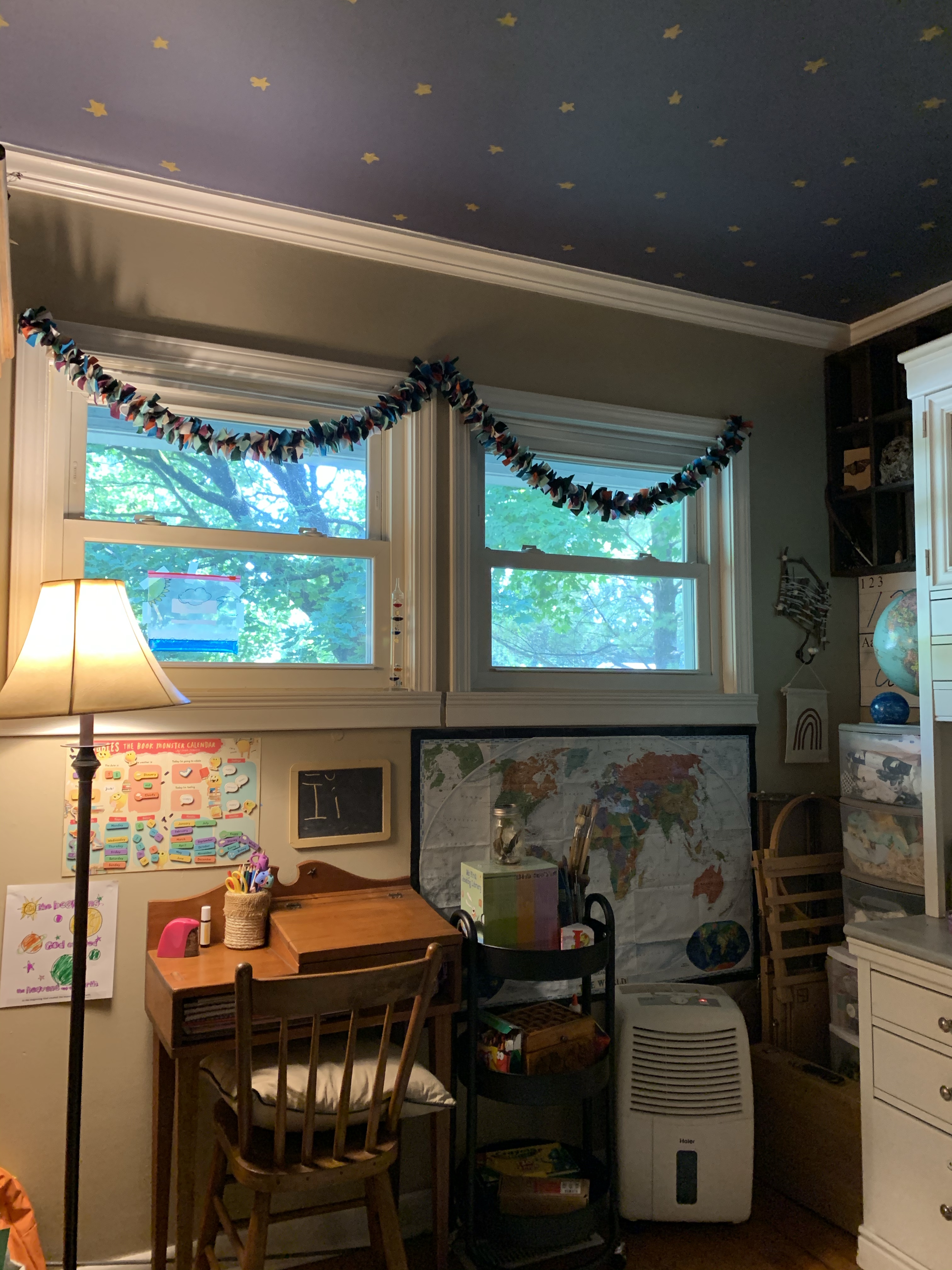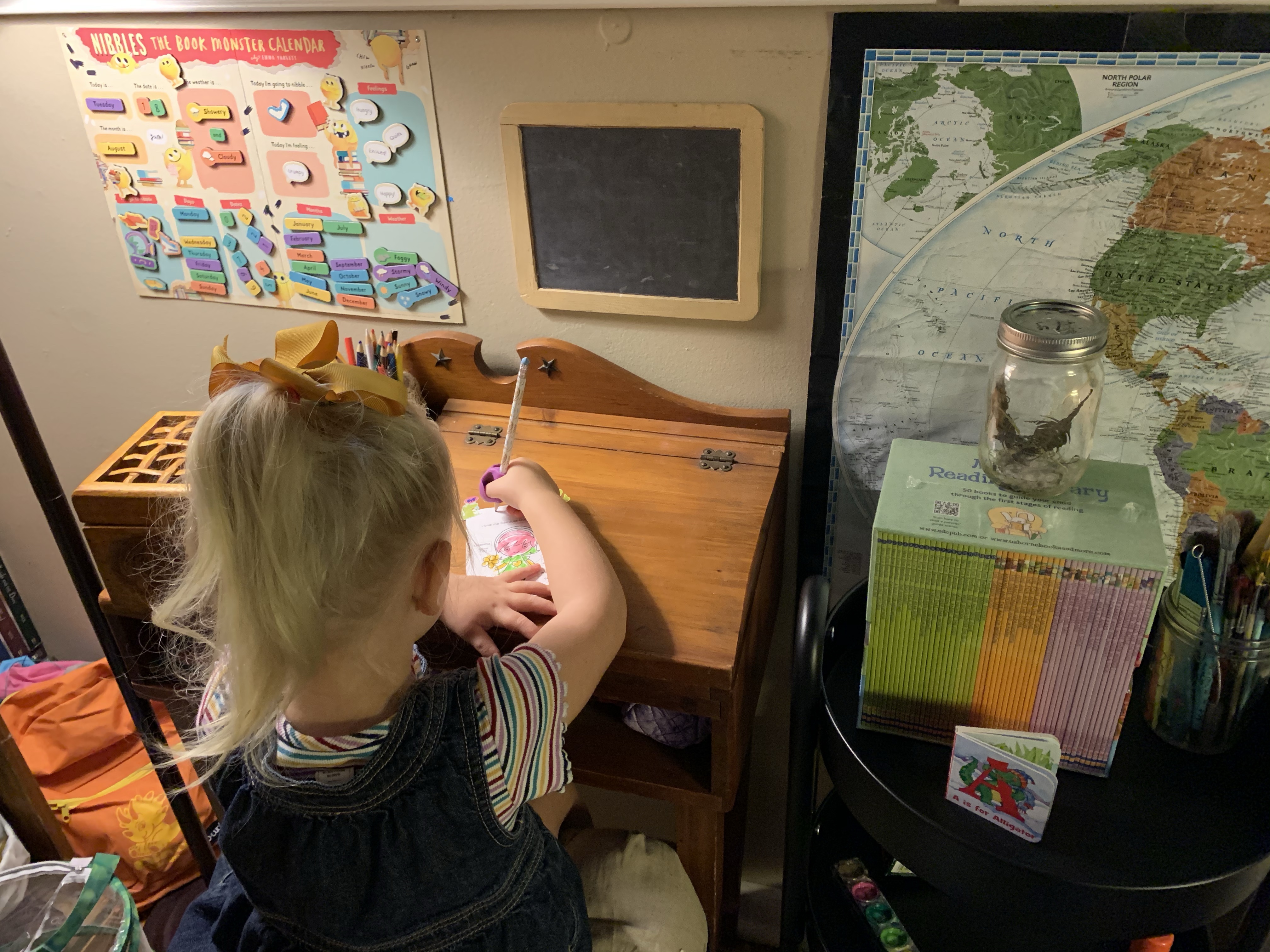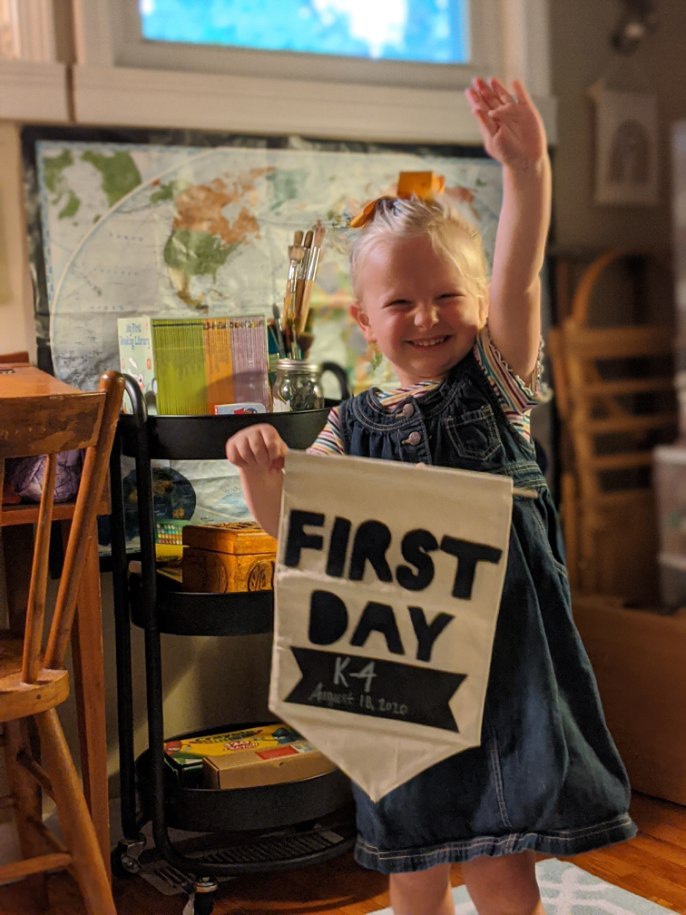 So, this year we’re doing things differently. Instead of spending hundreds of dollars on new, more, and convenience, we’ve sharpened last year’s pencils and crayons, moved around furniture to give an updated feel to the tiny classroom space, focused on natural elements, and handmade decorations. And, you know what? Lily is perfectly contented. She hasn’t complained once. The only thing she’s asked for is more books (hmmm, sounds like her grandfather and mother)! Instead of immediately giving in to her wants, she understands that she must earn new books by completing chores and saving her money.