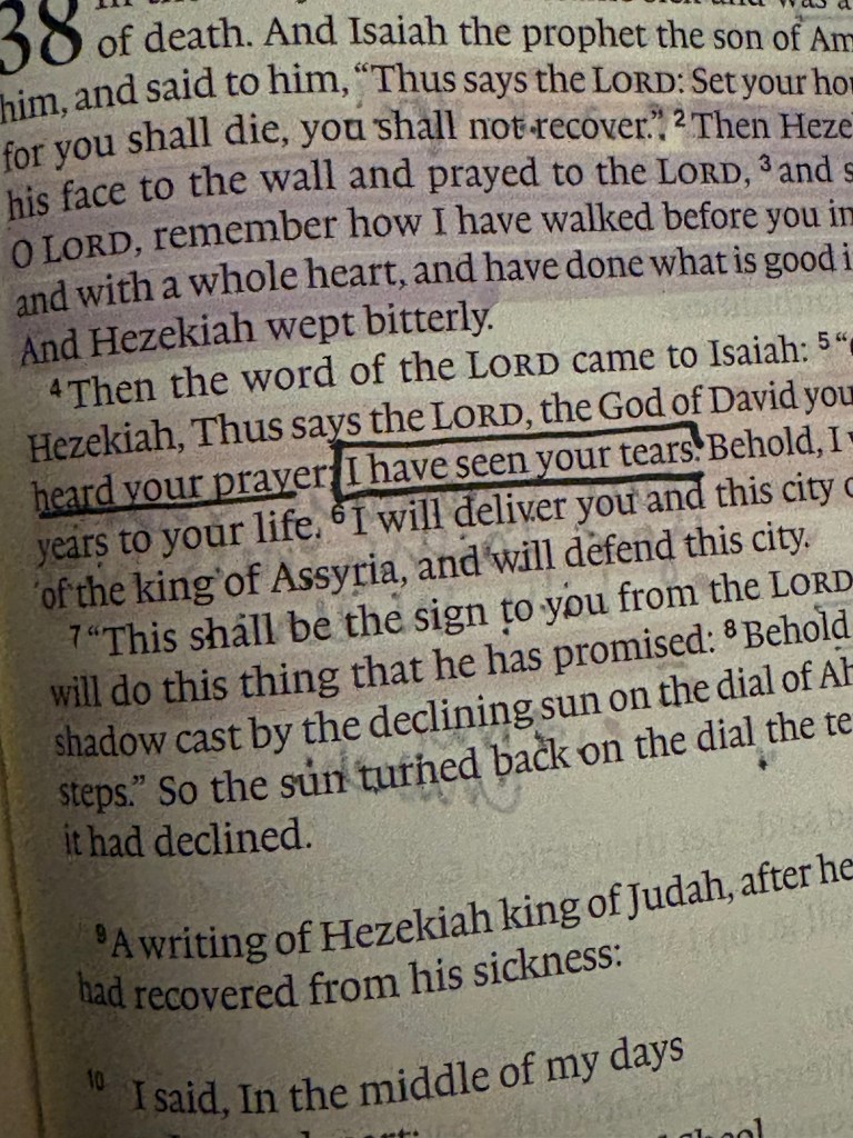 “…Thus says the LORD, the God of David your father: I have heard your prayer; I have seen your tears….”(Isaiah 38:5 ESV, emphasis mine).